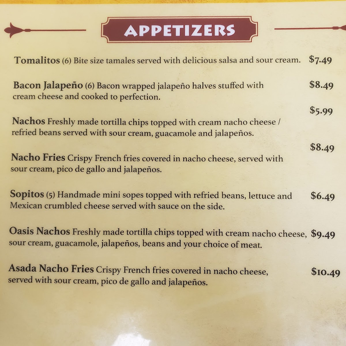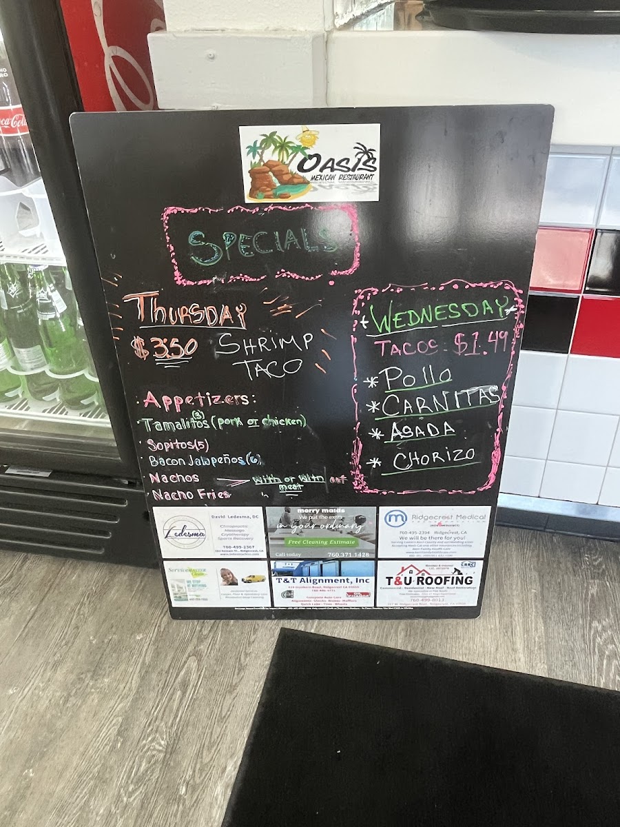 Don't forget to try their Quesabirrias, Menudo, or the comforting Birria Bowl for something extra special. For appetizers, you can indulge in crispy treats like Tamalitos, flavorful Oasis Nachos, or the delicious Asada Nacho Fries. If you're in the mood for something sweet, treat yourself to a warm Churro or the indulgent Churro A La Mode for dessert.
