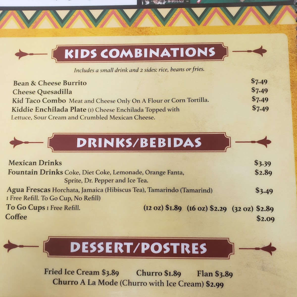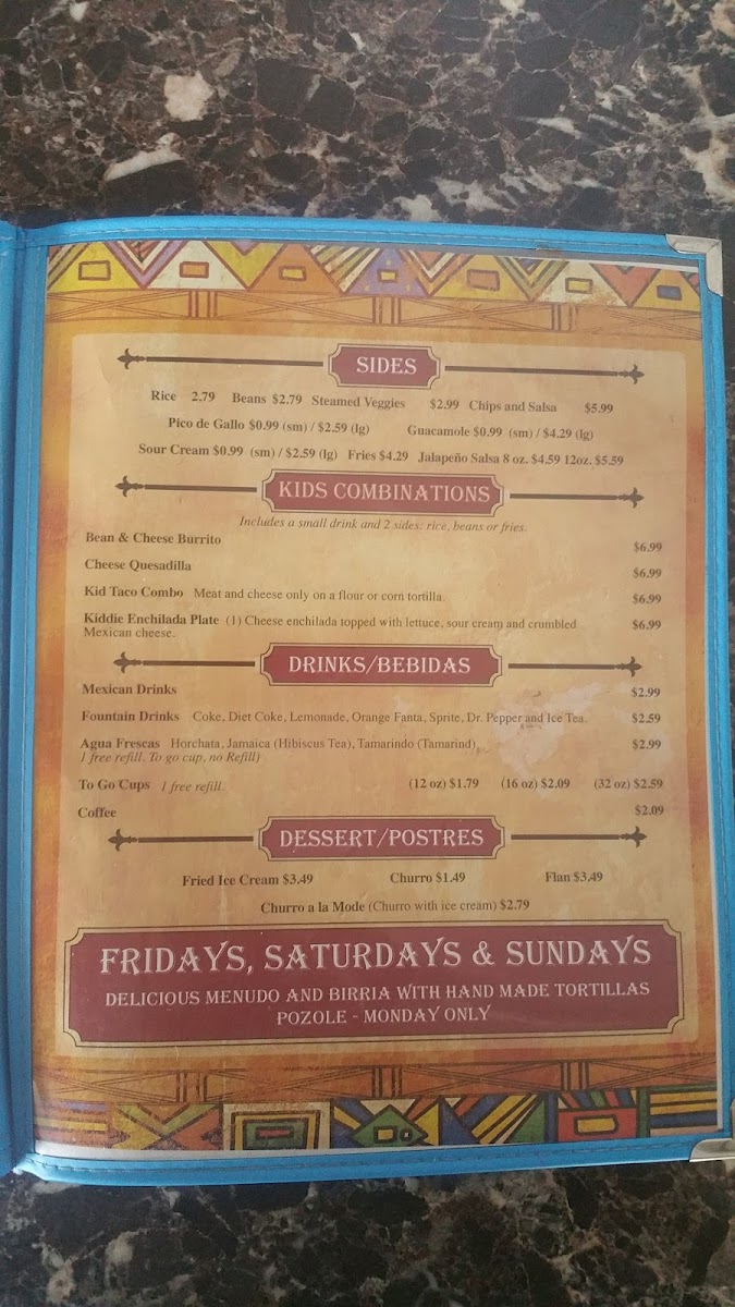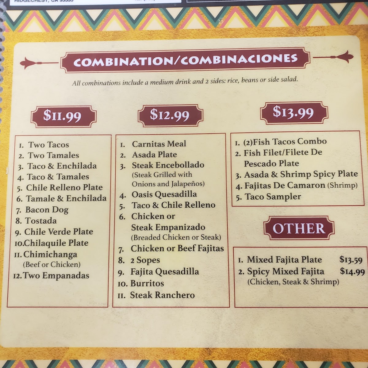 The restaurant also offers special options for those who enjoy a bit of spice, like the Spicy Mixed Fajita and the Asada & Shrimp Spicy Plate under Combinations (D). Seafood lovers will appreciate Combinations (C), which includes dishes like Fajita De Camaron (Shrimp), Fish Filet Pescado Plate, and the Asada & Shrimp Spicy Plate.