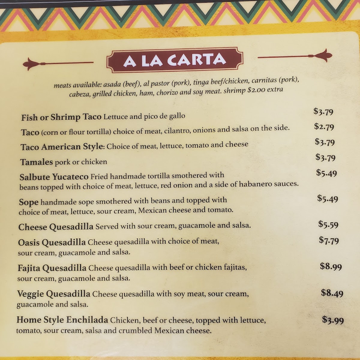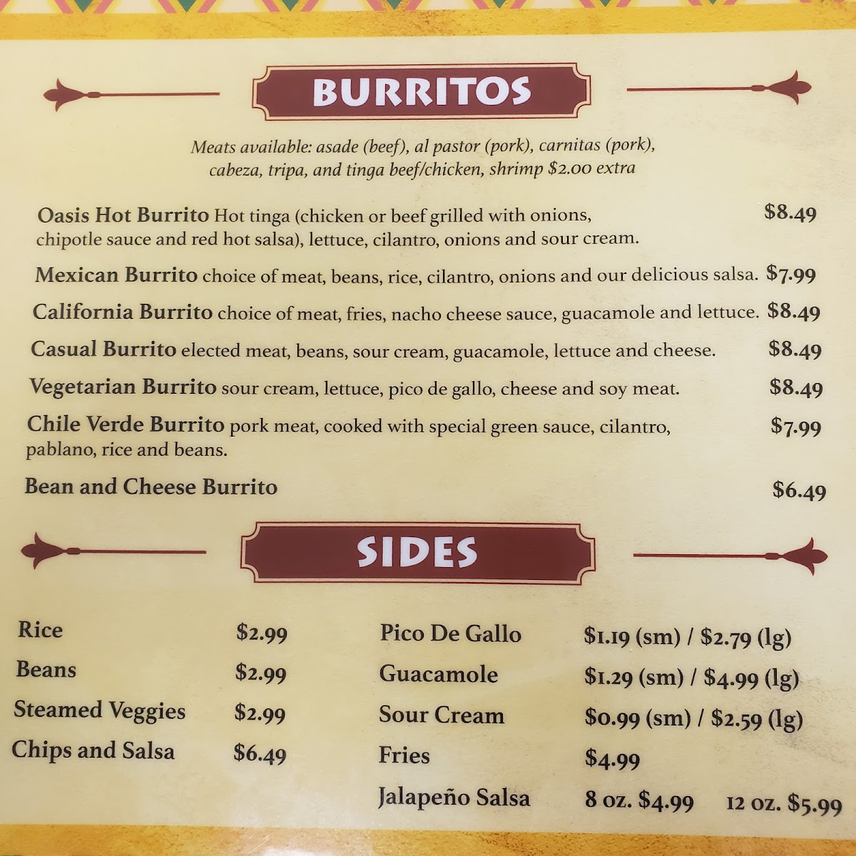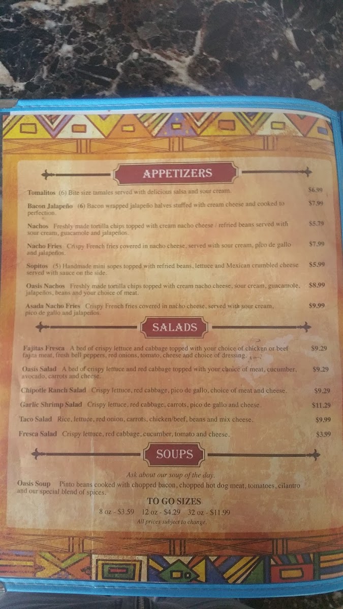 The Burritos section is extensive, with options like the classic Casual Burrito, the healthy Vegetarian Burrito, and the indulgent California Burrito. For those craving something lighter, the Soup menu offers the comforting Oasis Soup (12 oz). The A la Carta section features delicious individual dishes like the crispy Tostada, Oasis Quesadilla, and the satisfying Huarache.