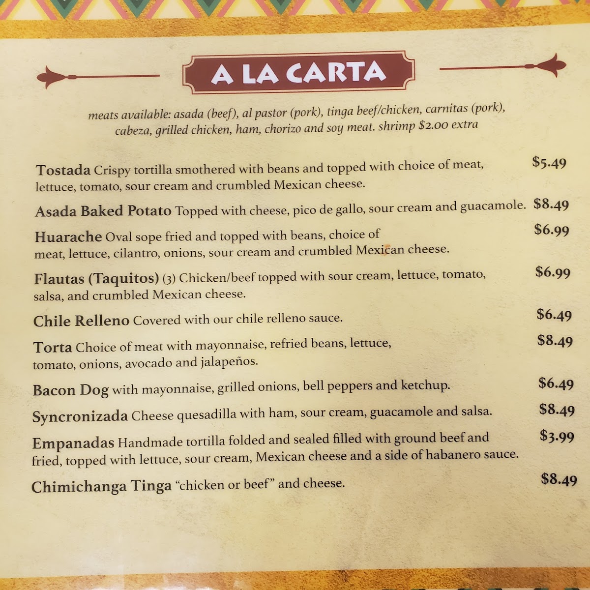 Crispy tortilla smothered with beans and topped with choice of meat, lettuce, tomato, sour cream, and crumbled Mexican cheese.